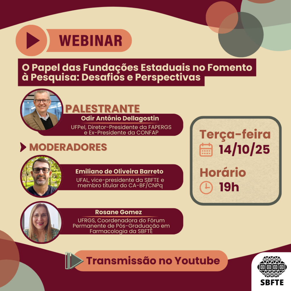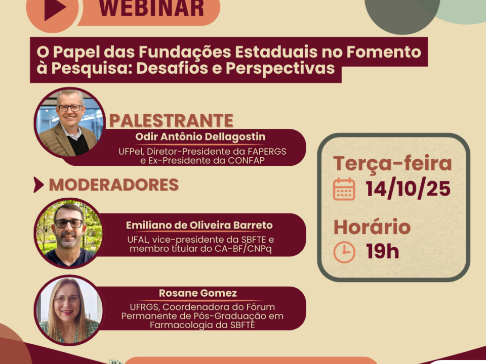 No dia 14 de outubro, às 19h, a Sociedade Brasileira de Farmacologia e Terapêutica Experimental (SBFTE) realizará o webinar “O Papel das Fundações Estaduais no Fomento […]