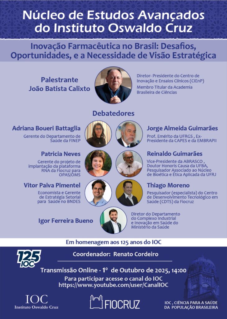 No dia 1º de outubro de 2025, às 14h, o Núcleo de Estudos Avançados do Instituto Oswaldo Cruz (IOC/Fiocruz) realizará um seminário online em homenagem aos […]