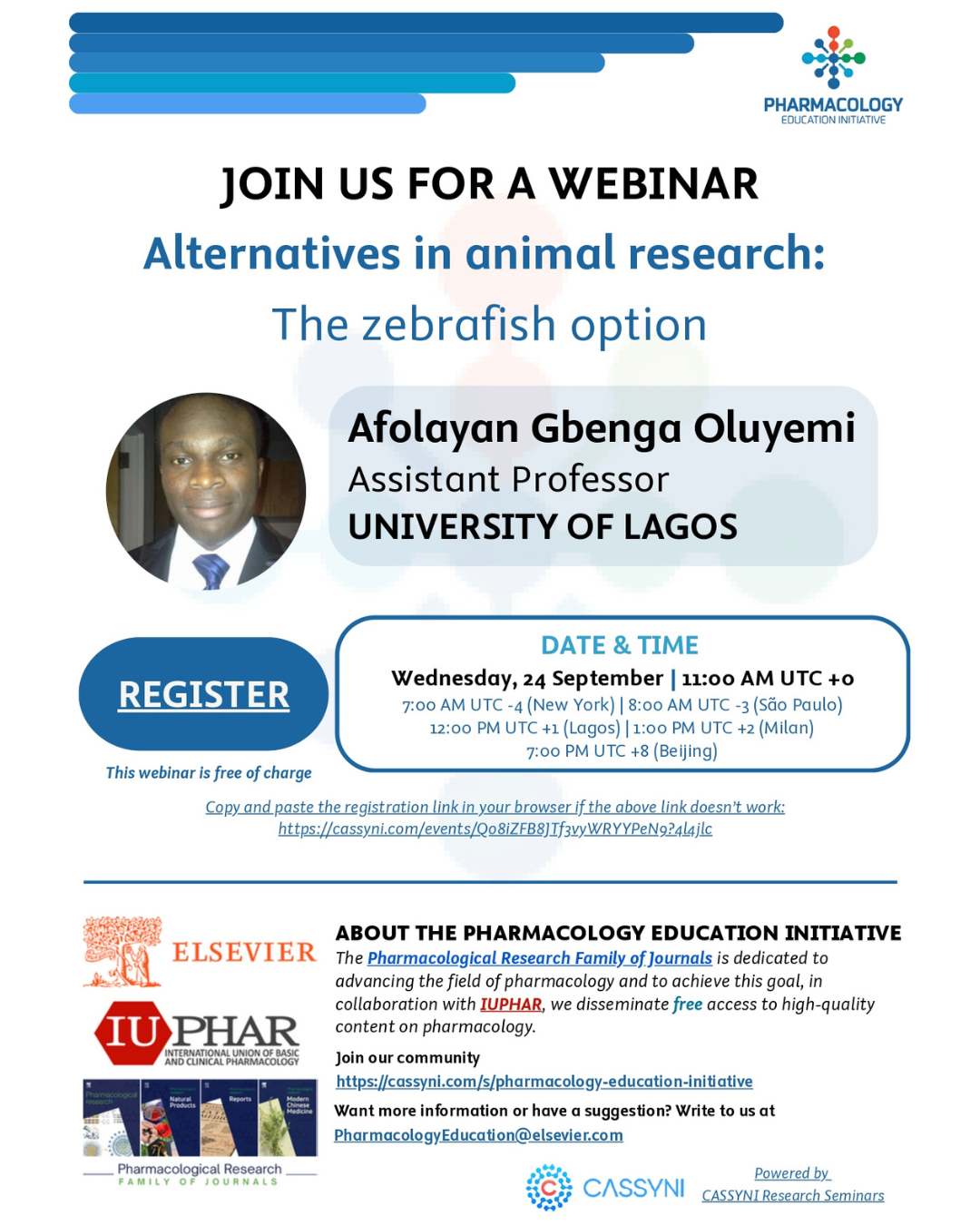 No dia 24 de setembro (quarta-feira), acontece o webinar “Alternatives in animal research: The zebrafish option”, que será ministrado por Afolayan Gbenga Oluyemi (Assistant Professor – University of Lagos).