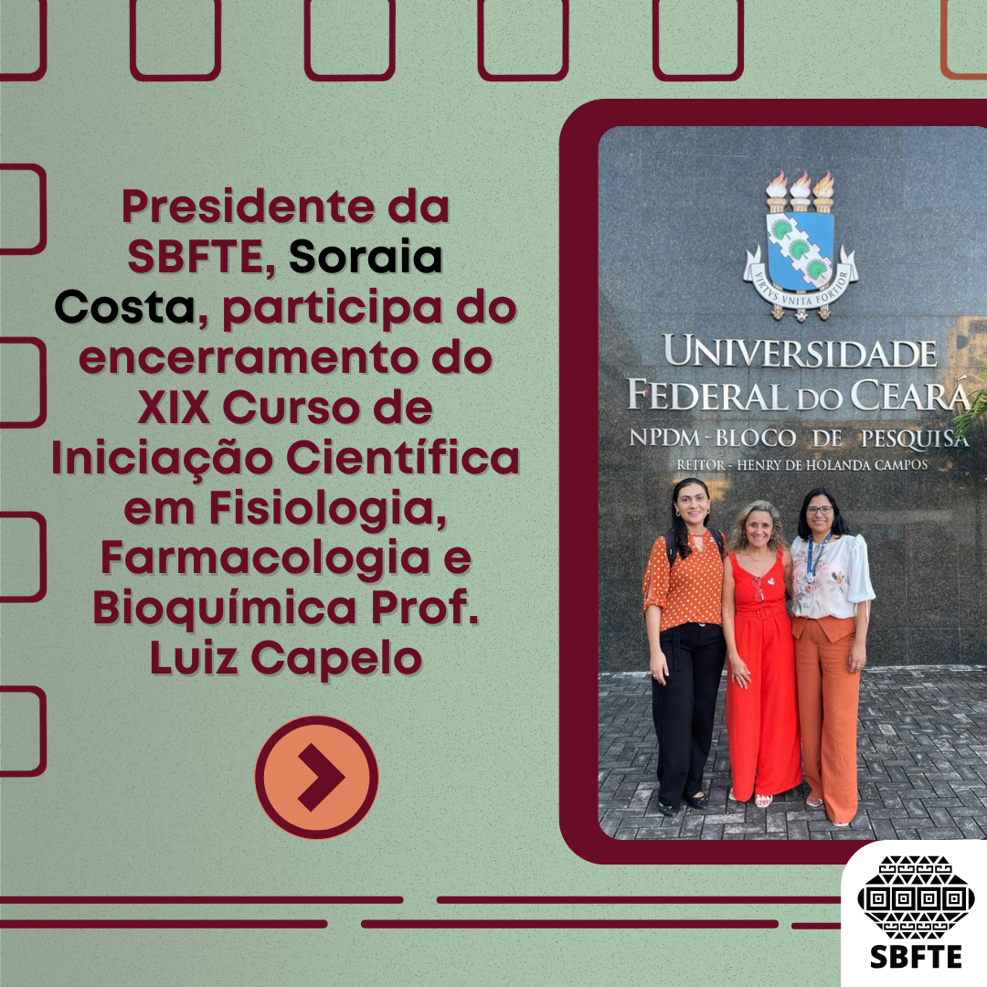 5 de setembro de 2025Confira a participação da Presidente da SBFTE, Soraia Costa, no encerramento do XIX Curso de Iniciação Científica em Fisiologia, Farmacologia e Bioquímica Prof. Luiz Capelo