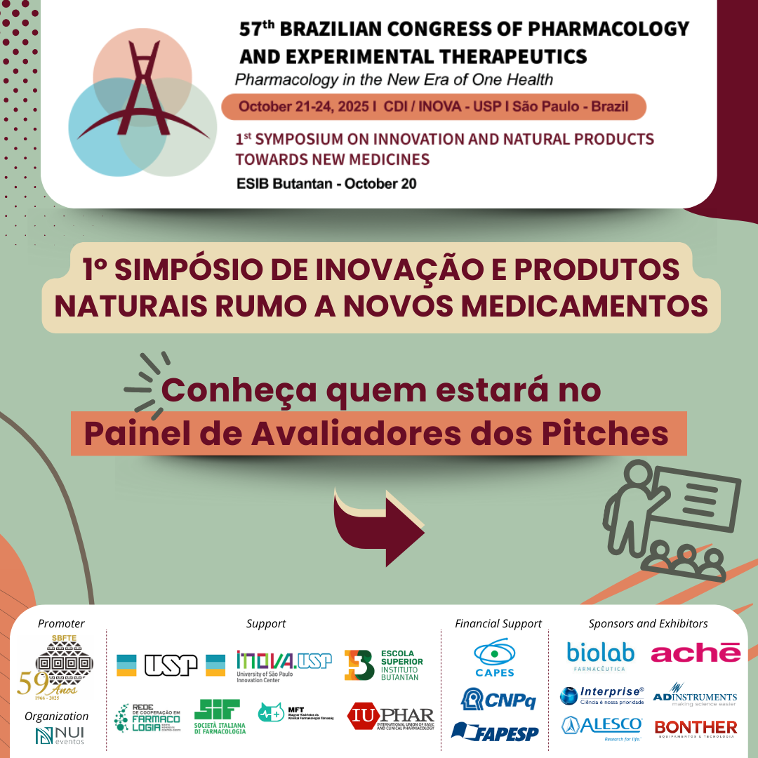 Na atividade Pré-congresso da Sociedade Brasileira de Farmacologia e Terapêutica Experimental (SBFTE) – 1º Simpósio de Inovação e Produtos Naturais rumo a Novos Medicamentos -, os pitches submetidos serão avaliados por um painel de especialistas