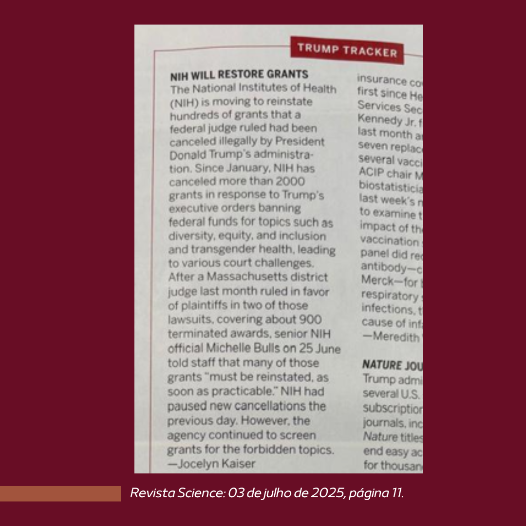 Boas novas! Em recente publicação na revista Science, o National Institutes of Health (NIH) anunciou a viabilização do retorno de centenas de auxílios financeiros que haviam sido cancelados ilegalmente pelo governo Trump. Decisões judiciais determinaram que cerca de 900 dessas subvenções, envolvendo temas como diversidade, equidade, inclusão e saúde transgênero, devem ser retomadas o quanto antes.