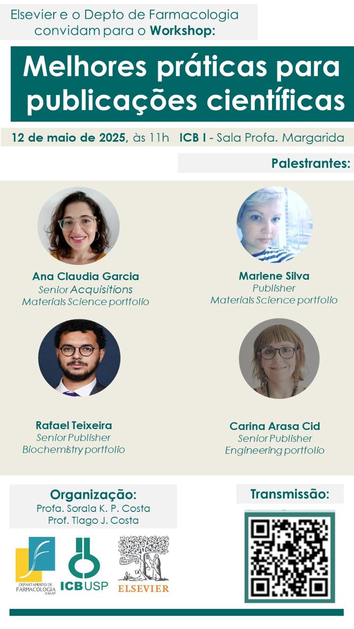 No dia 12 de maio de 2025, às 11h, a Elsevier e o Departamento de Farmacologia do Instituto de Ciências Biomédicas da Universidade de São Paulo (ICB-USP), realizam o workshop “Melhores práticas para publicações científicas”.