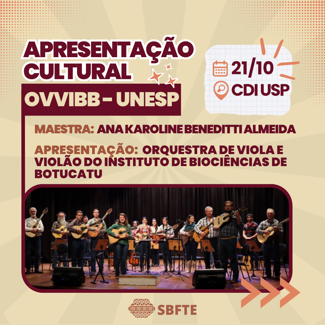 – Orquestra de Viola e Violão do Instituto de Biociências de Botucatu (OVVIBB), música popular e sertaneja raiz, com a força da viola caipira e do violão sob regência da maestra Ana Karoline Beneditti Almeida. Integrante da Orquestra Filarmônica do Instituto de Biociências (OFIBB) da UNESP de Botucatu, a OVVIBB nasceu de um um projeto de extensão da UNESP e reúne 28 integrantes, entre estudantes, servidores e membros da comunidade. Com a viola caipira e o violão como protagonistas e as vozes como fio condutor da emoção, o grupo apresenta um repertório que preserva e celebra a sonoridade do Brasil, mantendo viva sua tradição com sensibilidade e verdade.