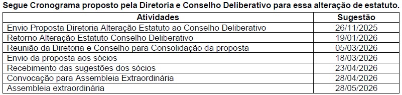 Em Reunião de Diretoria e Conselho Deliberativo realizada em 05/03/2026, foi deliberado encaminhar aos Sócios Efetivos proposta de alteração do Estatuto com os seguintes objetivos: simplificar o processo de aceitação de novos sócios; reduzir o tempo de espera para a segunda chamada em assembleias e incluir o cargo de secretária executiva no estatuto.