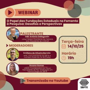 No dia 14 de outubro, às 19h, a Sociedade Brasileira de Farmacologia e Terapêutica Experimental (SBFTE) realizará o webinar “O Papel das Fundações Estaduais no Fomento à Pesquisa: Desafios e Perspectivas”, que será conduzido pelo prof. Odir Antônio Dellagostin (UFPel, diretor-presidente da FAPERGS e ex-presidente da CPNFAP). O webinar contará com a mediação de Emiliano Barreto (UFAL, vice-presidente da SBFTE e membro titular do CA-BF/CNPq) e Rosane Gomez (UFRGS, coordenadora do Fórum Permanente de Pós-graduação em Farmacologia da SBFTE).