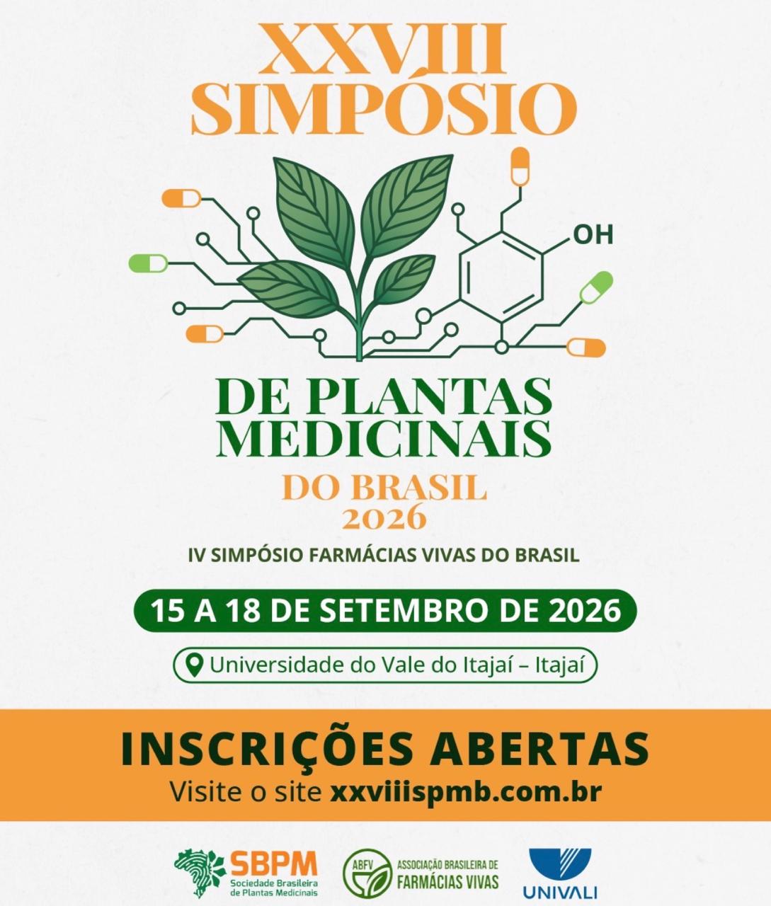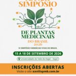 Estão abertas as inscrições para o XXVIII Simpósio de Plantas Medicinais do Brasil, que será realizado de 15 a 18 de setembro de 2026, na Universidade do Vale do Itajaí (UNIVALI), em Itajaí (SC).