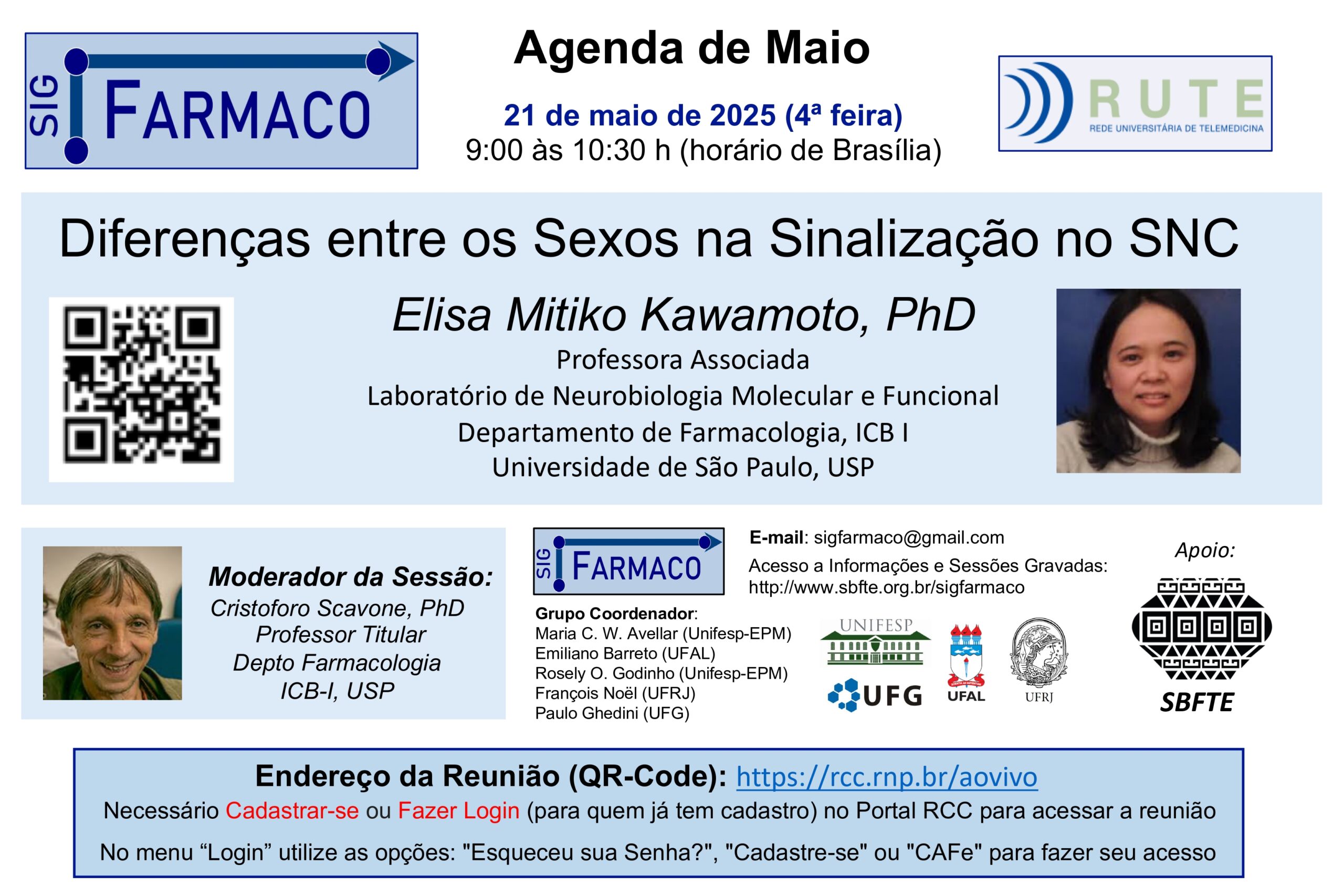 O evento é organizado pelo grupo SIG Farmaco e terá a participação da professora Elisa Mitiko Kawamoto, do Laboratório de Neurobiologia Molecular e Funcional – Departamento de Farmacologia do Instituto de Ciências Biomédicas da Universidade de São Paulo (ICB-USP). Essa conversa será mediada pelo professor Cristoforo Scavone (ICB-USP).