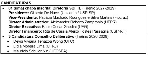 Conforme já divulgado, enviamos abaixo as candidaturas recebidas ao término da primeira fase do Processo Eleitoral SBFTE 2025 (Edital 15 de outubro de 2025) e referendadas pela Comissão Eleitoral.